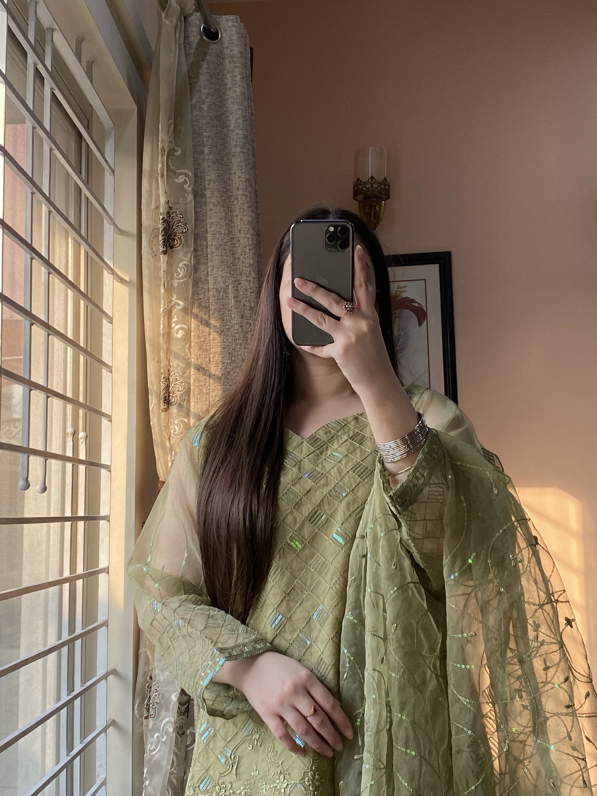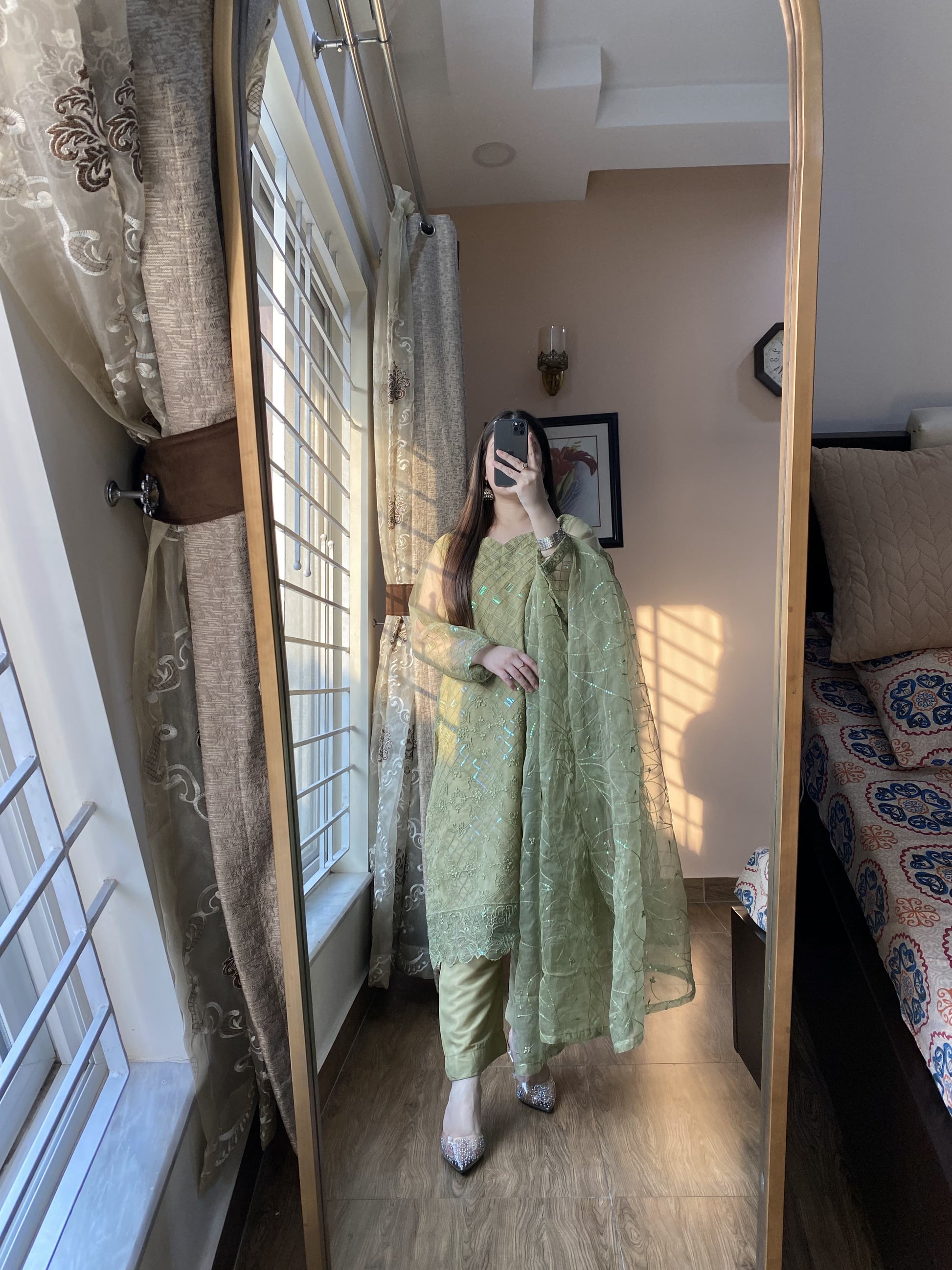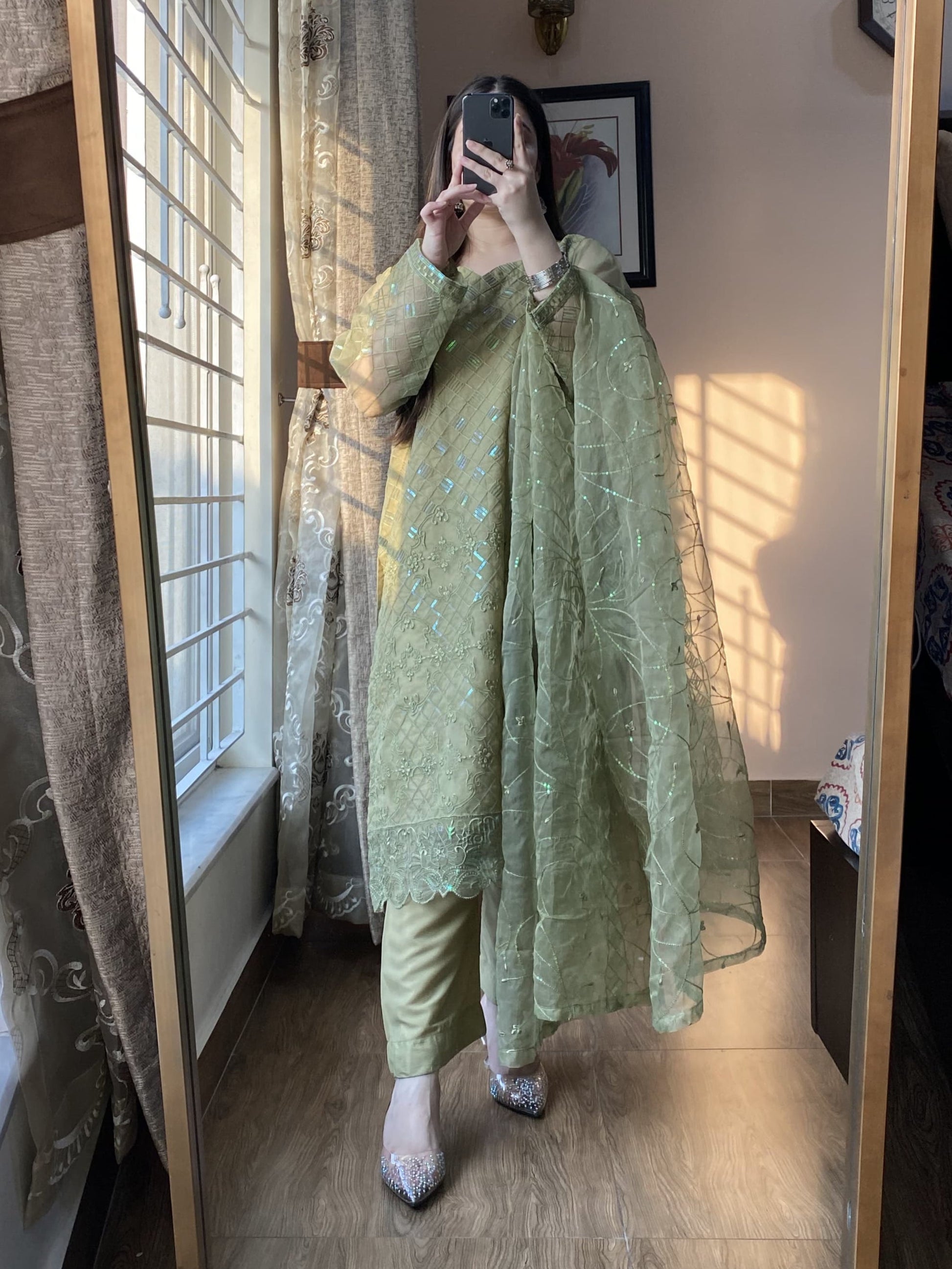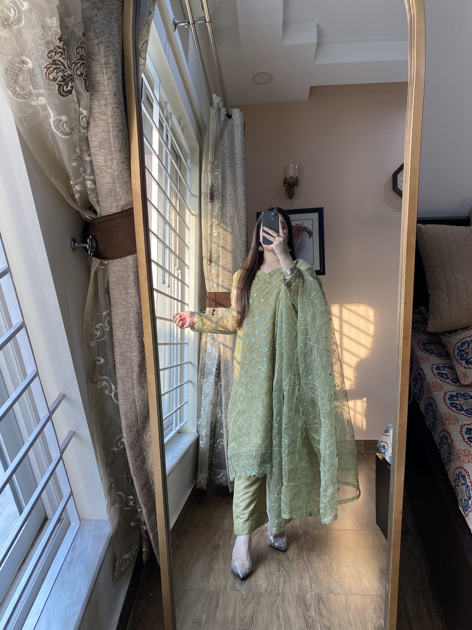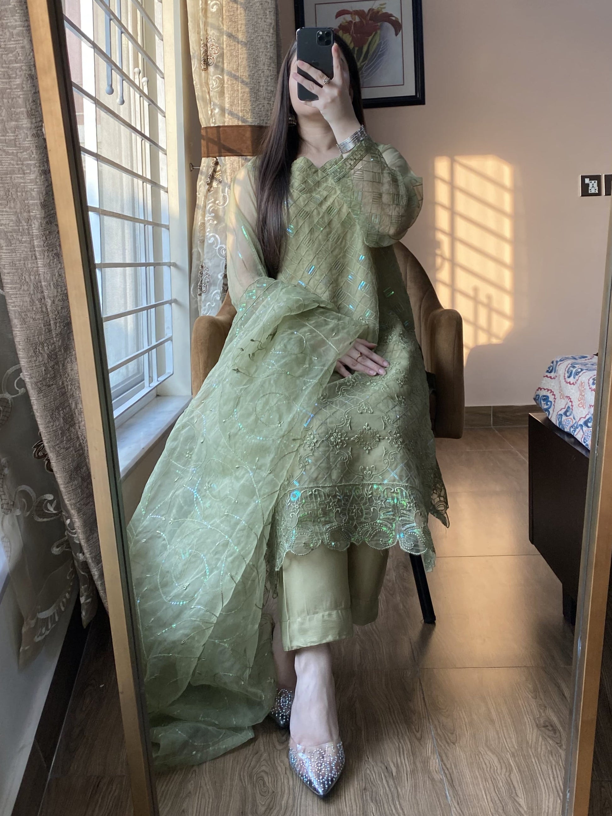 Elevate your wardrobe with this exquisite 4-piece stitched organza ensemble, featuring intricate sequin embroidery that exudes elegance. The organza dupatta is adorned with shimmering sequin details, adding a touch of luxury. The box-style grip trousers offer a structured yet comfortable fit, while the Atal inner ensures seamless wear. Perfect for festive occasions and formal gatherings, this ensemble blends timeless charm with modern sophistication, making you stand out effortlessly.