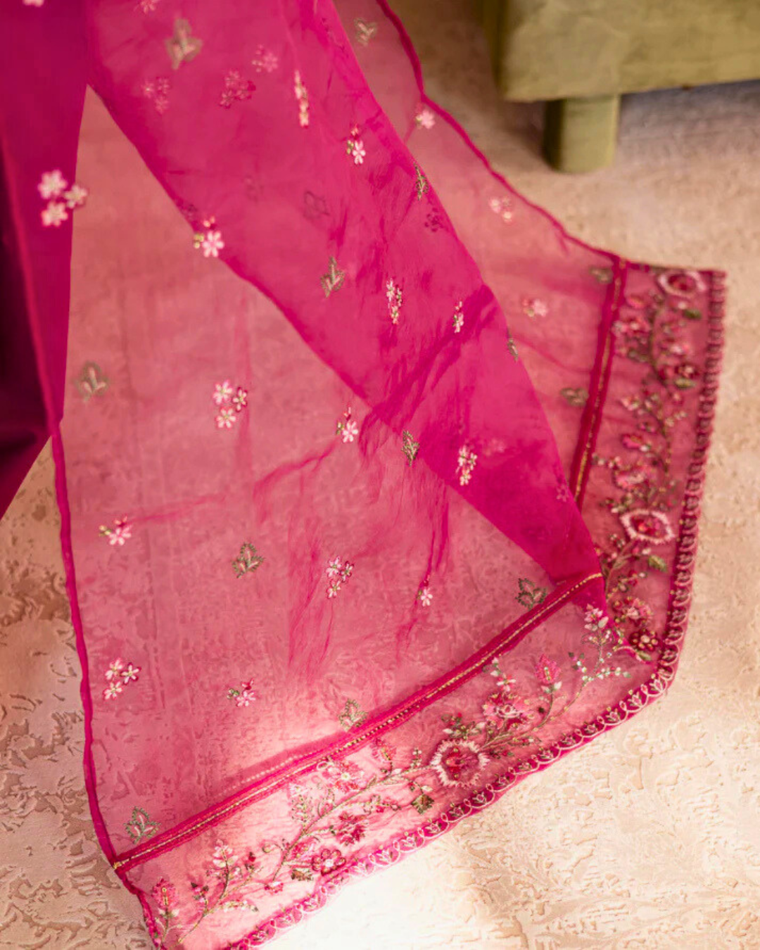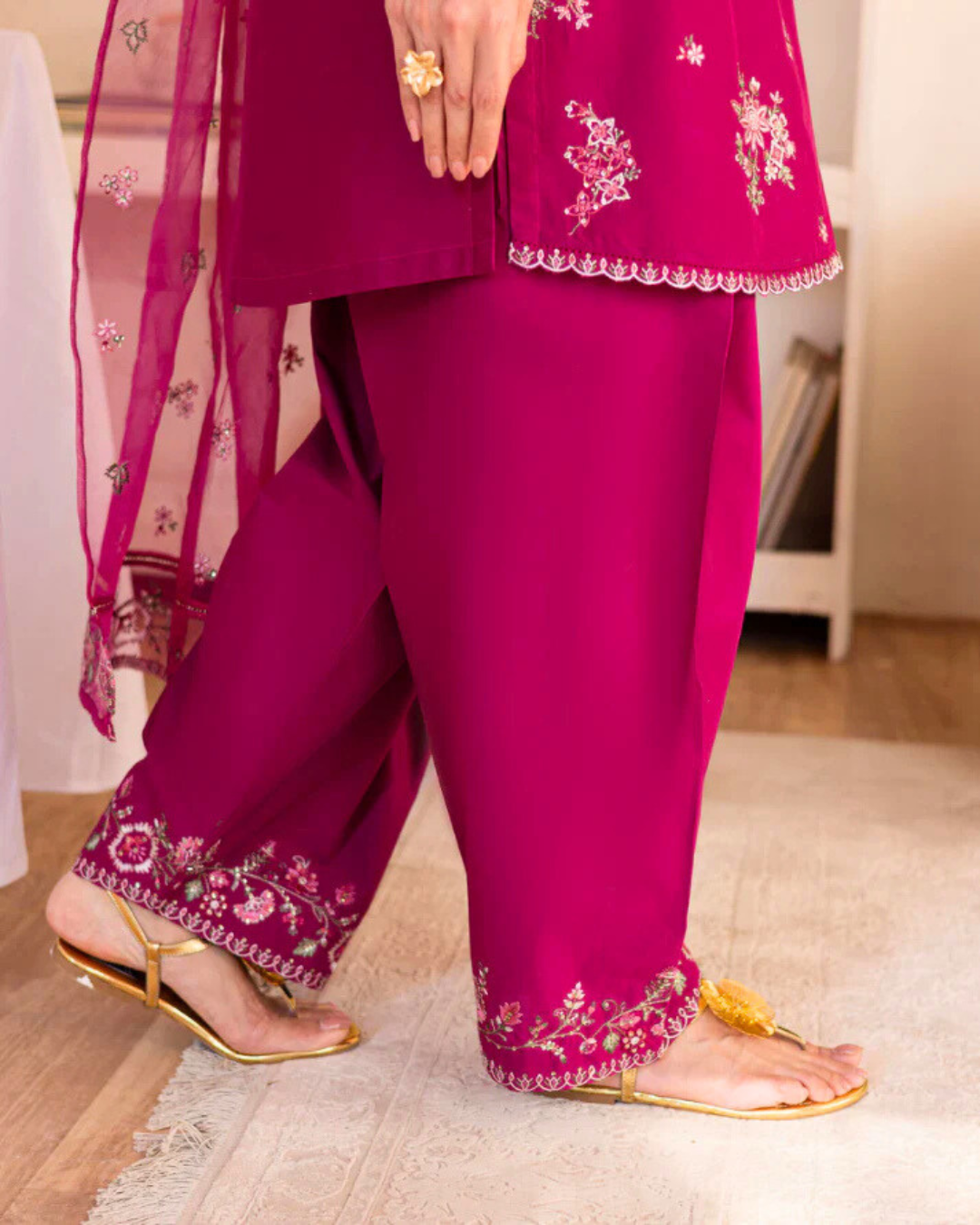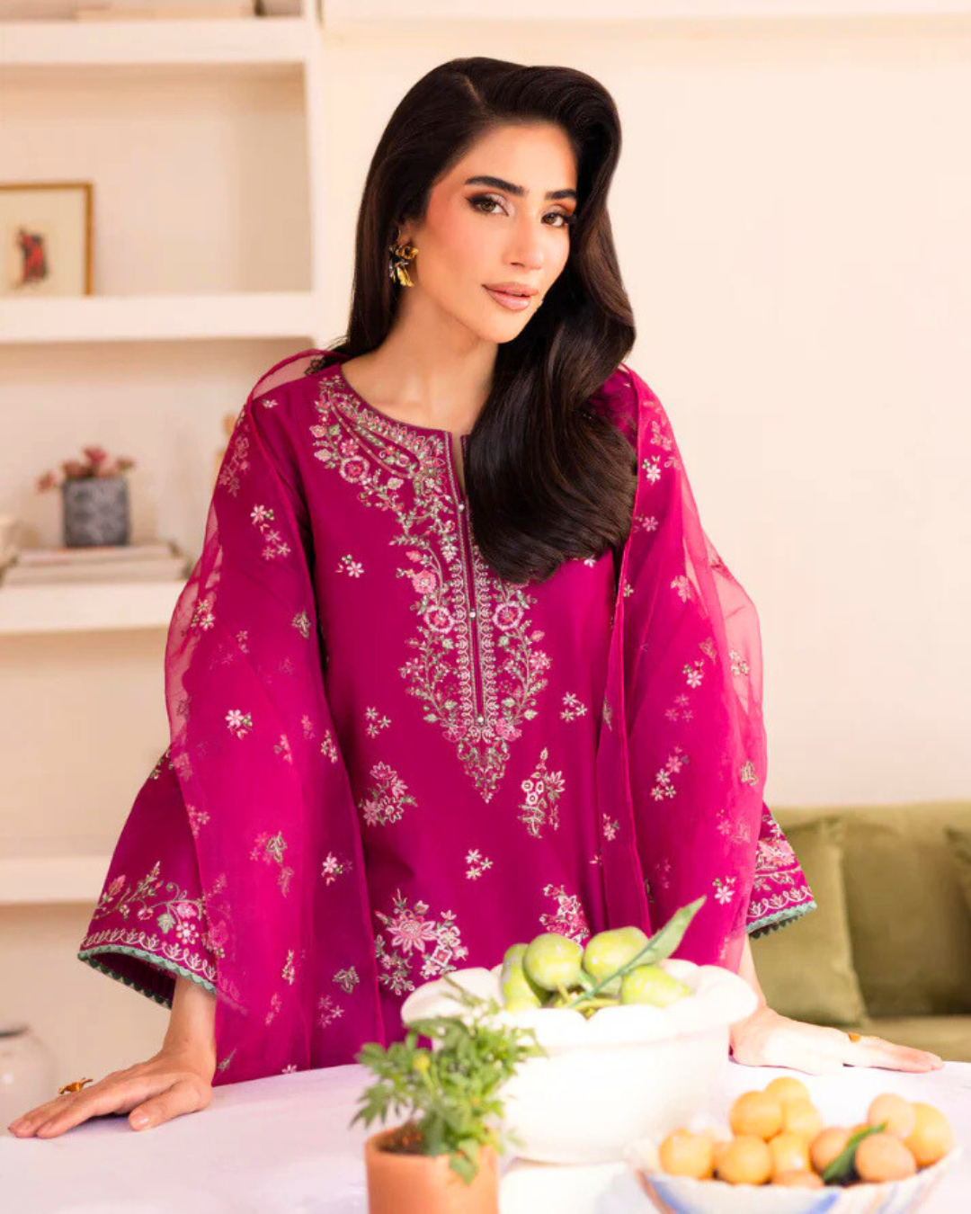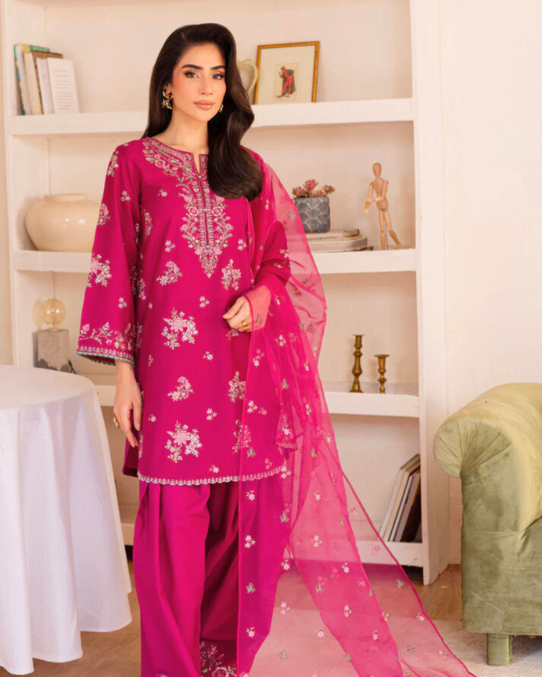 A touch of fuchsia elegance! This 3-piece stitched cotton outfit features a beautifully embroidered shirt with a detailed neckline and border embroidery, complemented by a modern lifted hemline and subtle organza piping for added charm. Paired with a cotton embroidered trouser and a spread embroidered organza dupatta, this ensemble adds the perfect balance of sophistication and festive flair to your summer wardrobe.