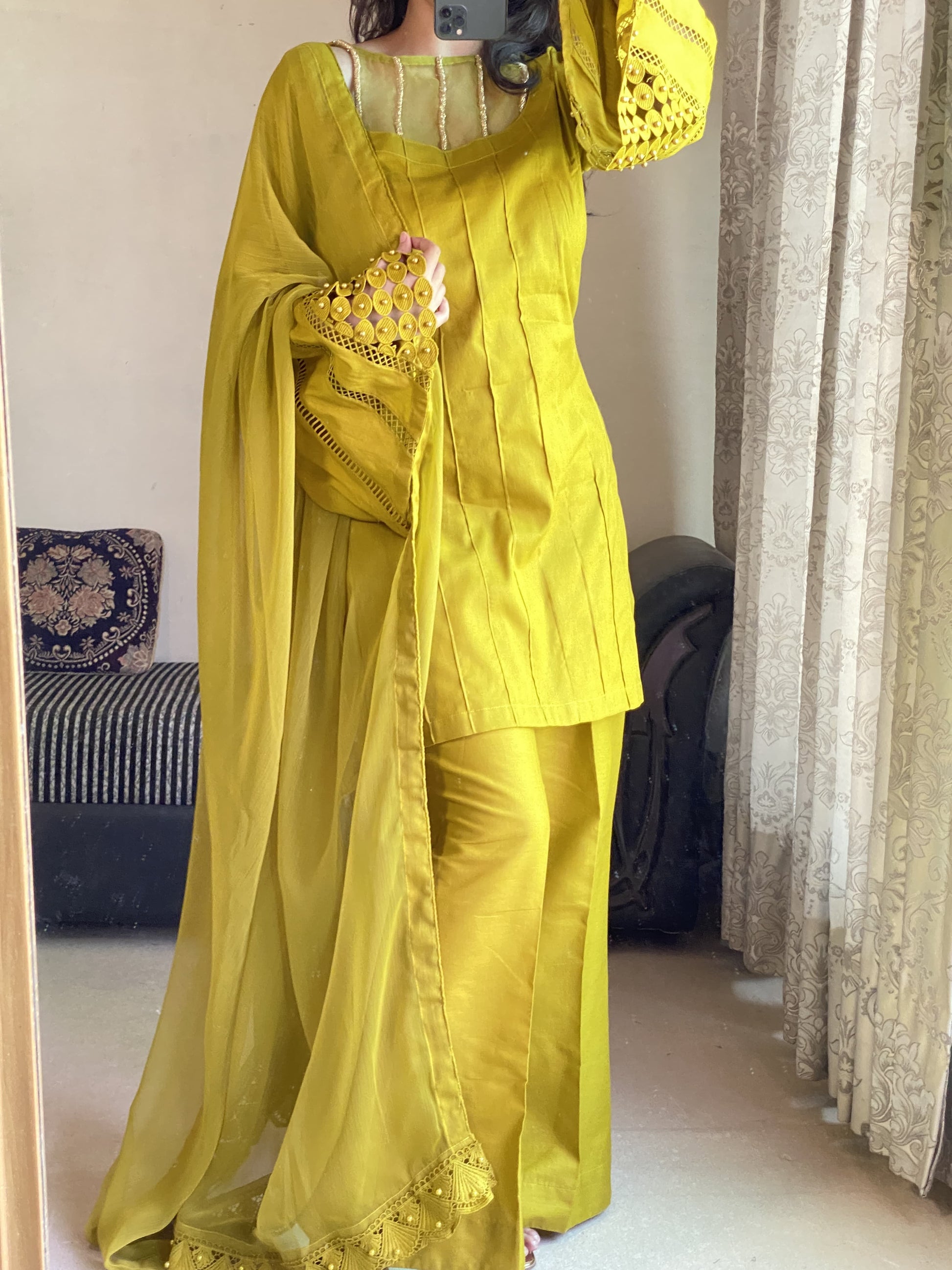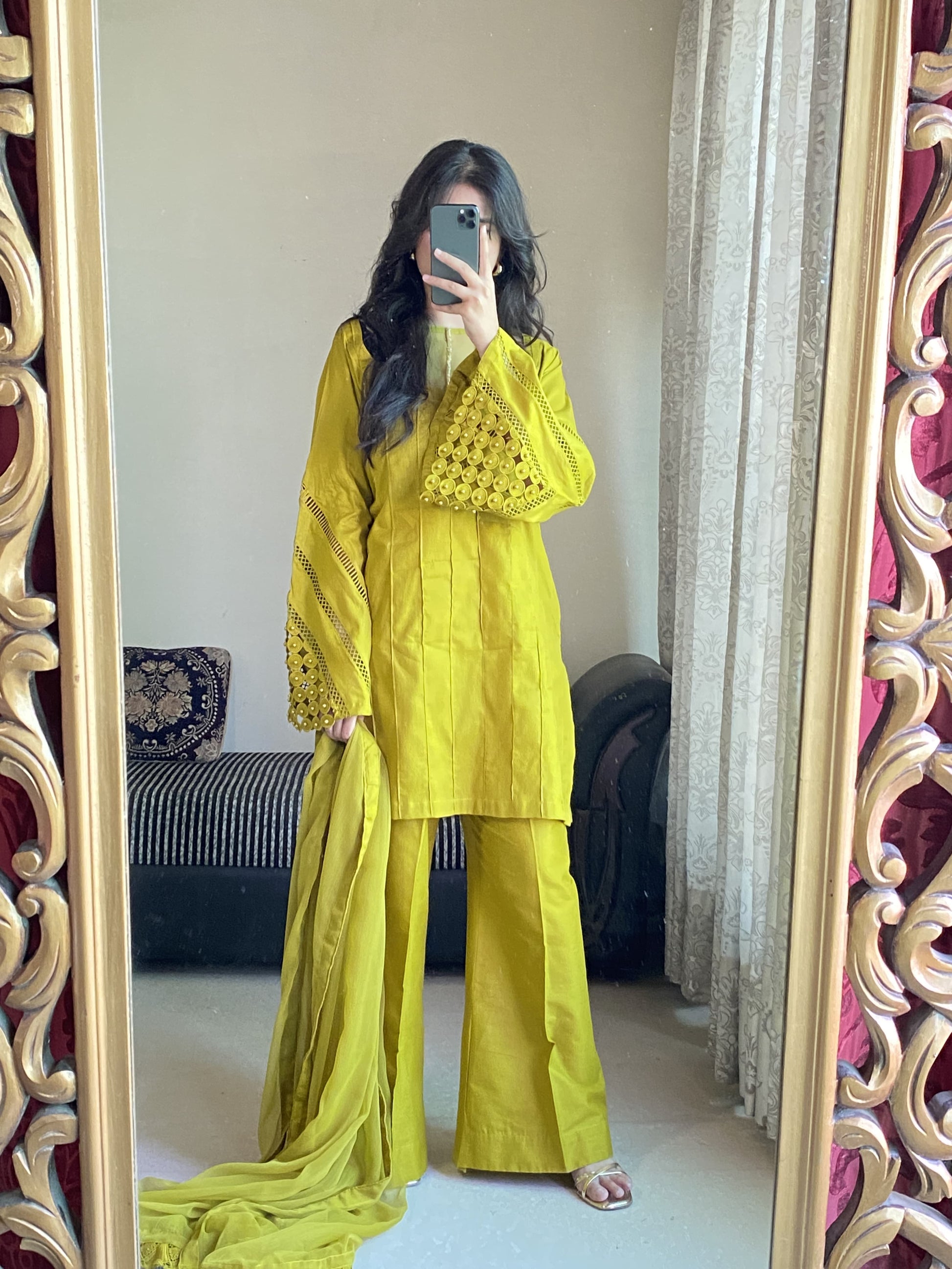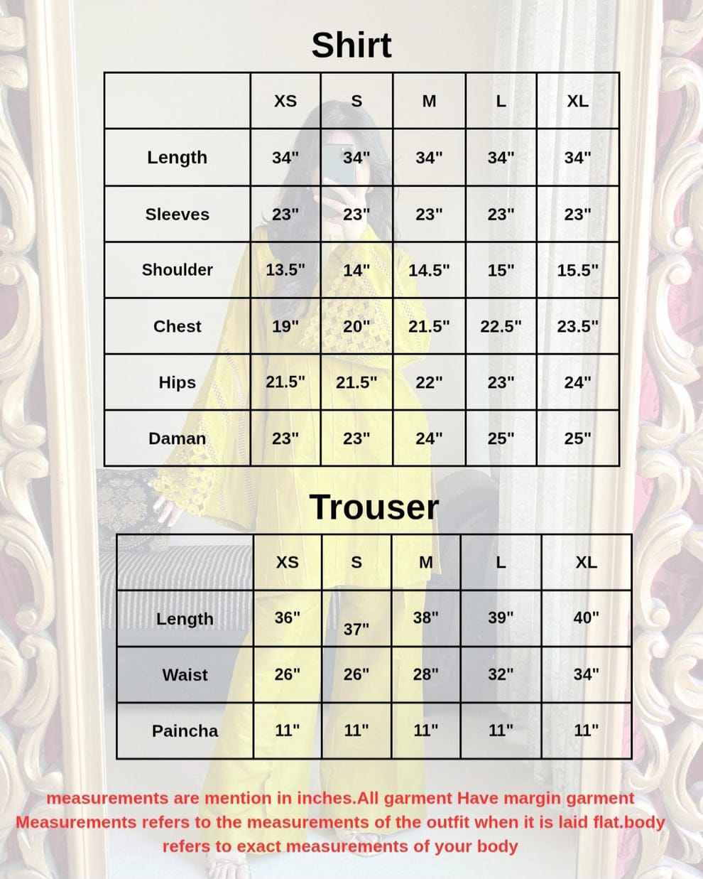 Make a style statement with this beautifully stitched 3-piece Lawn Cotton dress in a refreshing green shade. The shirt features ready embroidery on the neckline with organza detailing, pleats work on the front, and crochet (karoshia) work on the sleeves finished with three types of elegant laces. Paired with a trendy bell-bottom style trouser and a soft chiffon dupatta enhanced with lace on both side pallus, this outfit is a perfect blend of tradition and modern flair—ideal for festive gatherings.
