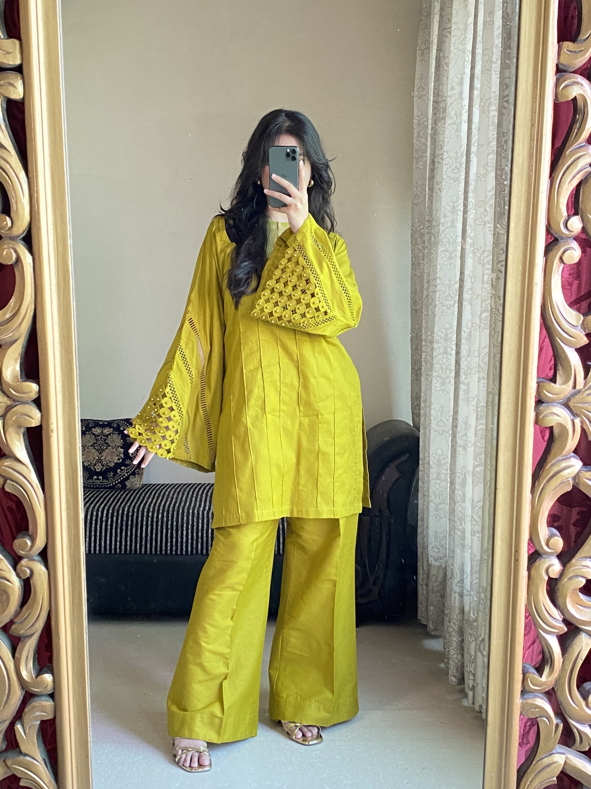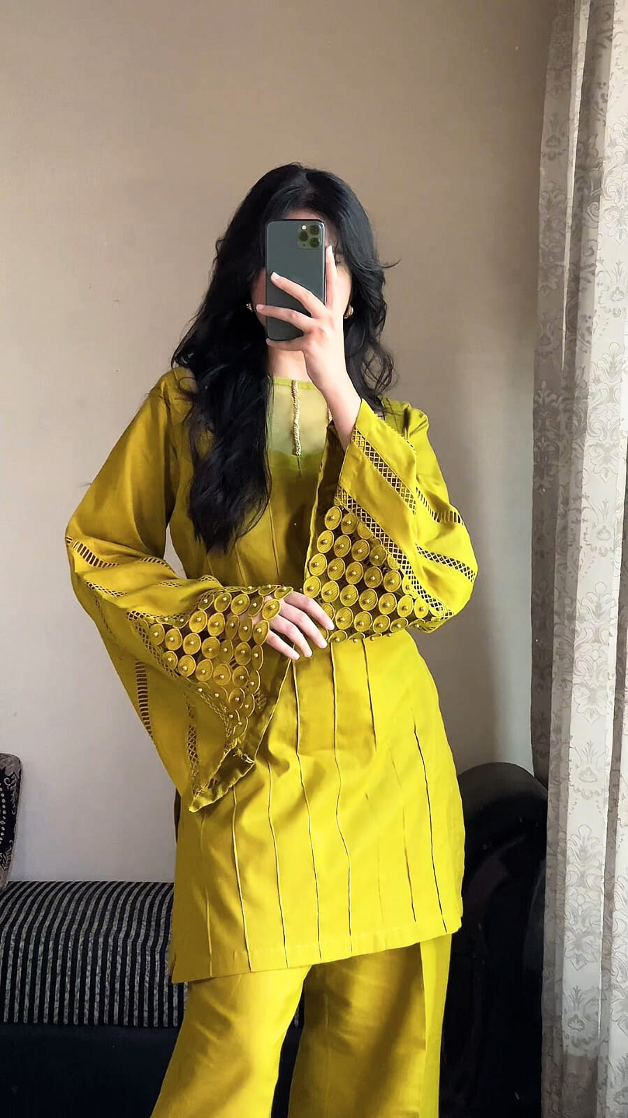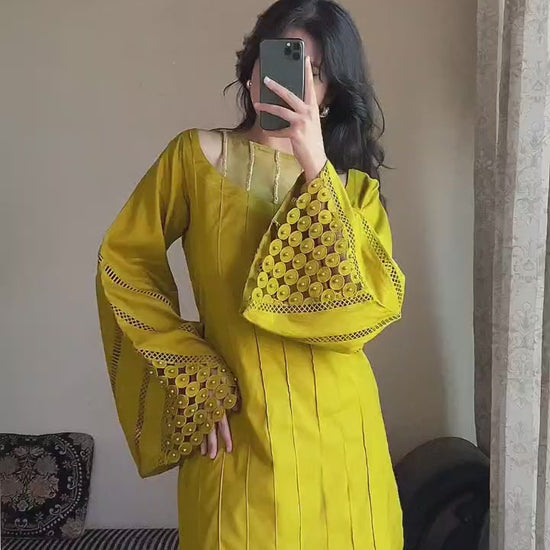 Make a style statement with this beautifully stitched 3-piece Lawn Cotton dress in a refreshing green shade. The shirt features ready embroidery on the neckline with organza detailing, pleats work on the front, and crochet (karoshia) work on the sleeves finished with three types of elegant laces. Paired with a trendy bell-bottom style trouser and a soft chiffon dupatta enhanced with lace on both side pallus, this outfit is a perfect blend of tradition and modern flair—ideal for festive gatherings.