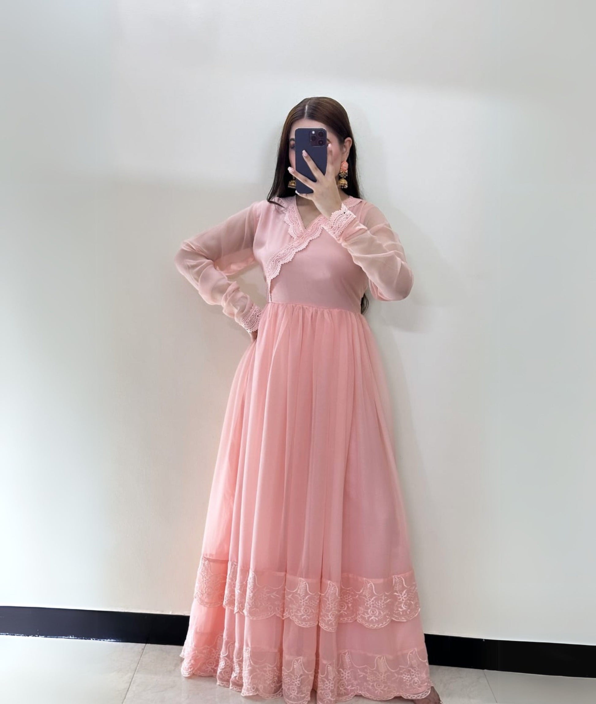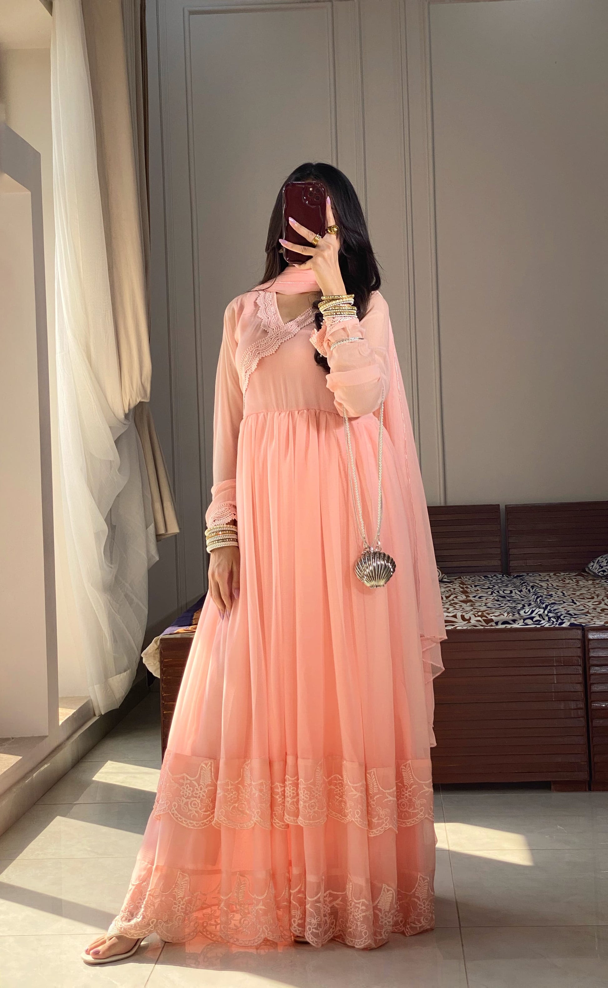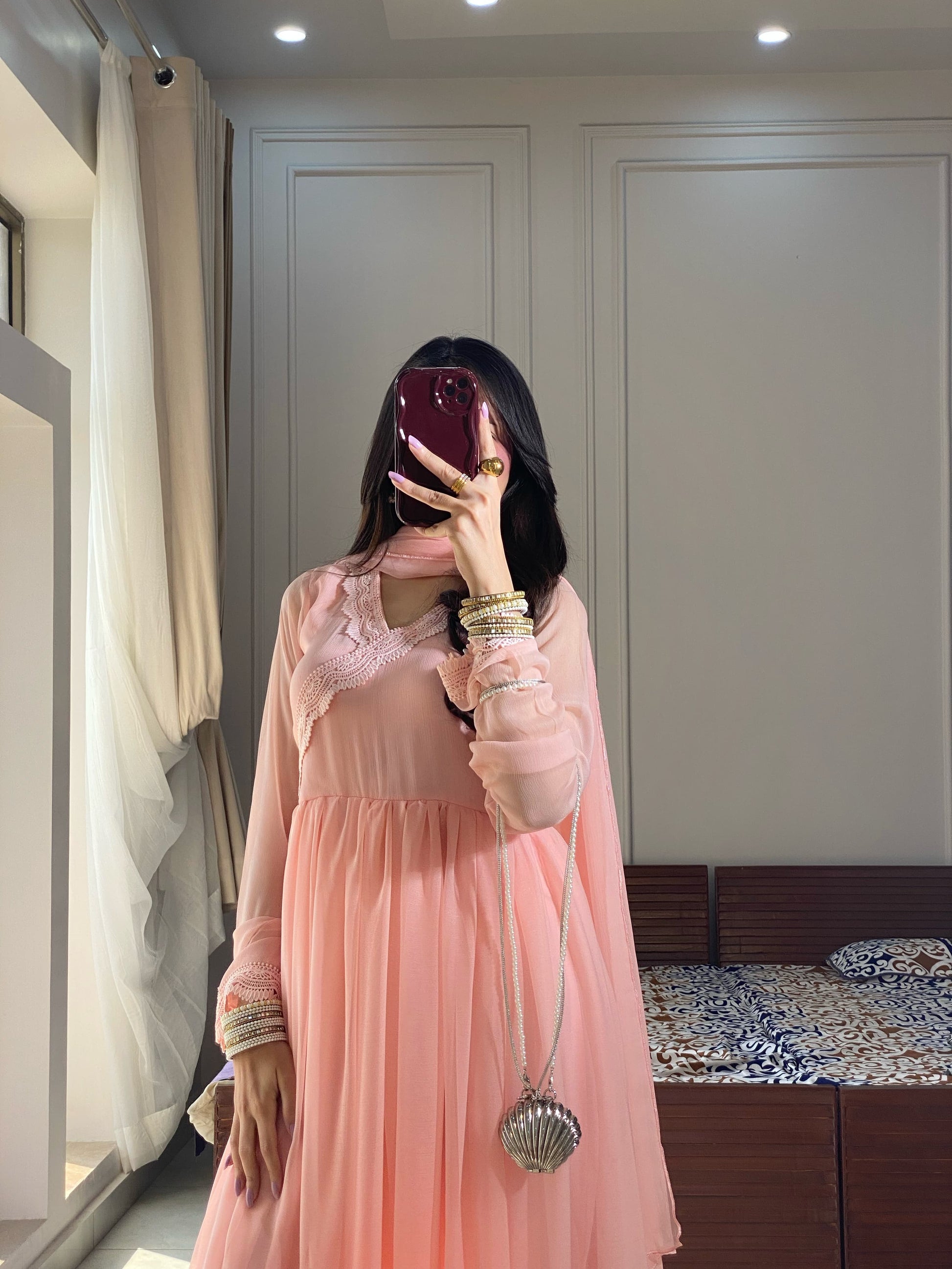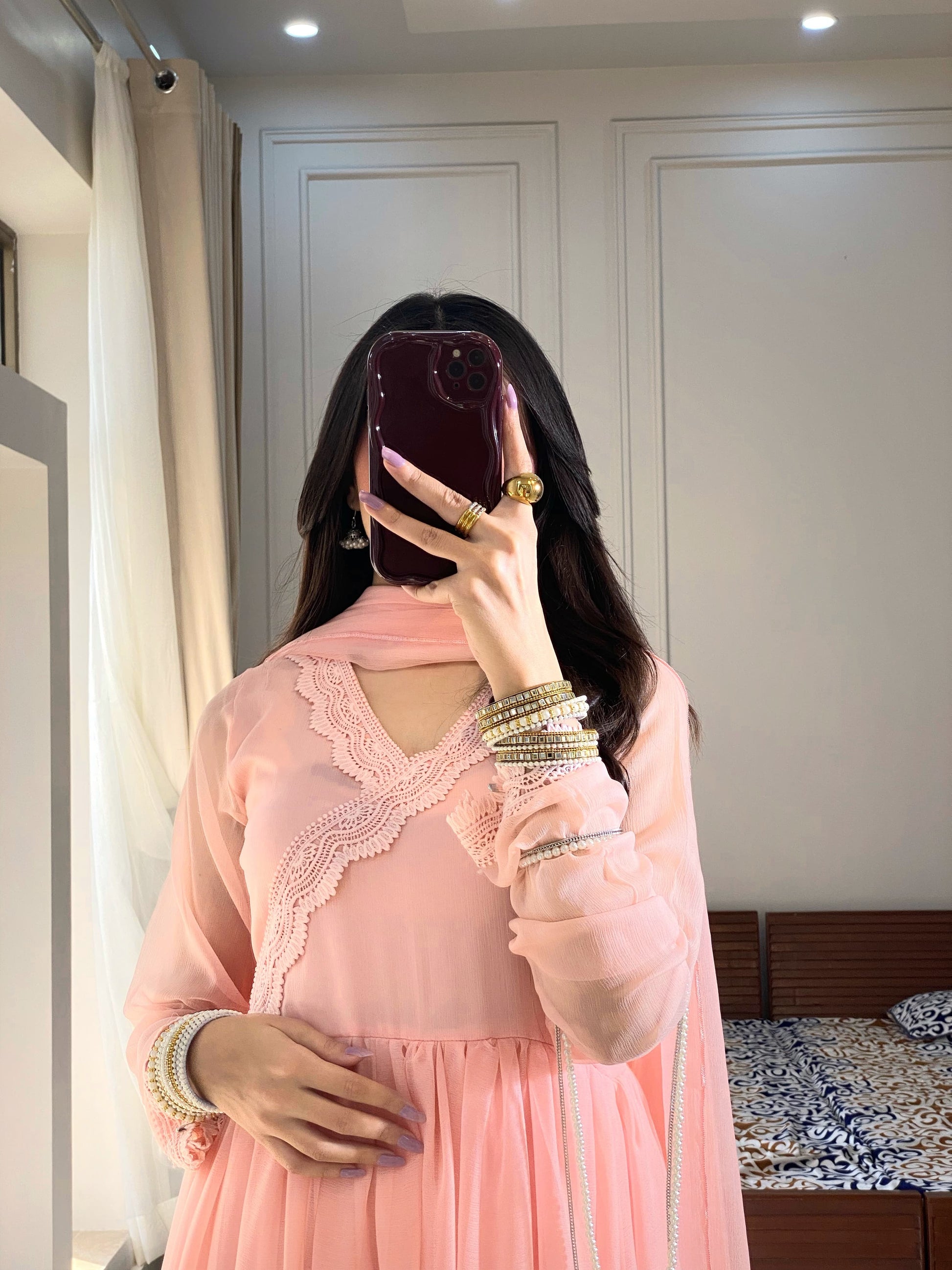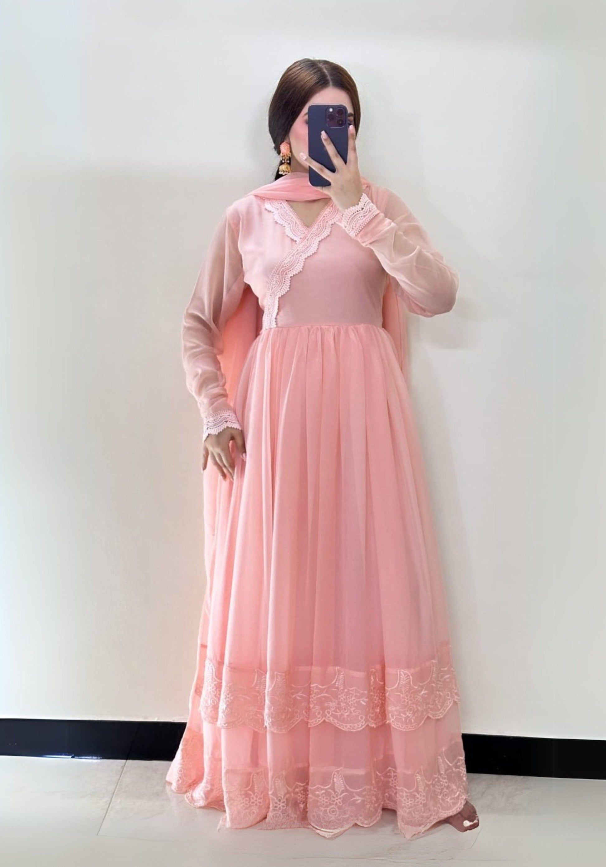 This exquisite chiffon pishwas features four intricately stitched panels with a dramatic 180-inch flair, creating a stunning silhouette. The neckline is adorned with delicate lace detailing, adding a touch of elegance, while the churidar sleeves enhance the traditional appeal. The flair is embellished with double embroidery, showcasing intricate craftsmanship. The outfit is paired with a comfortable atal inner and grip trousers for a perfect fit. A plain chiffon dupatta completes the ensemble, offering a subtle contrast to the detailed embroidery. This pishwas is a perfect blend of tradition and sophistication, ideal for special occasions.